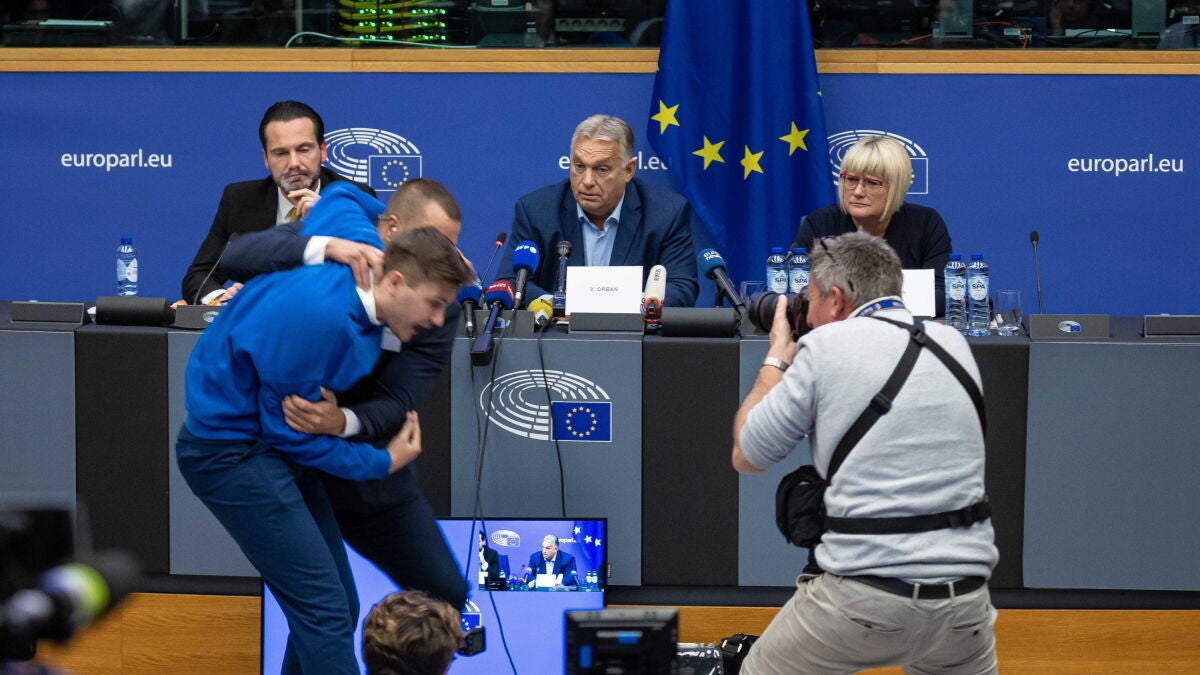 Un activista ha irrumpido en el Parlamento Europeo de Estrasburgo durante la rueda de prensa del primer ministro húngaro Viktor Orbán. Orbán se encontraba ejerciendo su turno de palabra junto a la eurodiputada Kinga Gál, vicepresidenta del grupo Patriotas por Europa.
