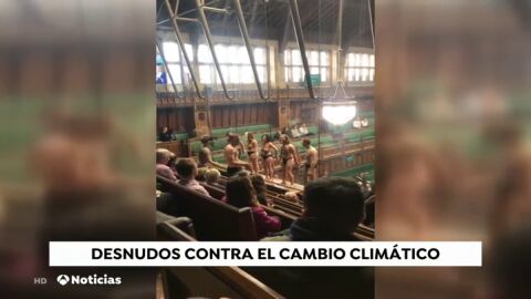La asociación 'Extinction Rebellion' han protagonizado uno de los momentos más llamativos del día. Los asistentes a la protesta se han desnudado para llamar la atención de los políticos sobre la crisis climática y ecológica en la Cámara de los Comunes durante un debate sobre el Brexit.