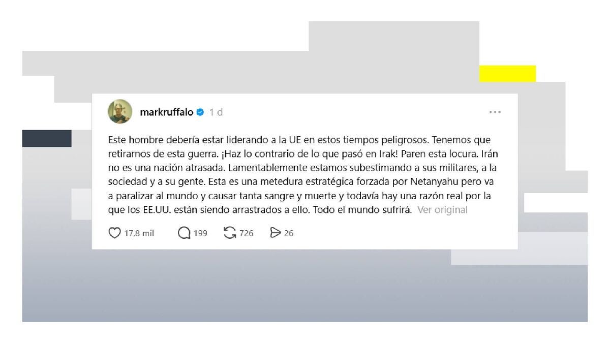 Ruffalo no ha sido el único en pronunciarse, ya que la guerra de Irán ha dejado oleadas de reacciones en todo el mundo. El presidente español dejó clara su postura hace unos días, negando a Estados Unidos el uso de sus bases militares para atacar al país asiático. Tras ello, otros tantos rostros conocidos se han mostrado en contra o a favor, entre ellos por ejemplo Susan Sarandon, quien ya aplaudió la postura con respecto a Gaza.