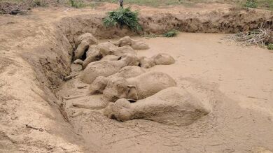 El agónico rescate de once elefantes atrapados en un foso de lodo