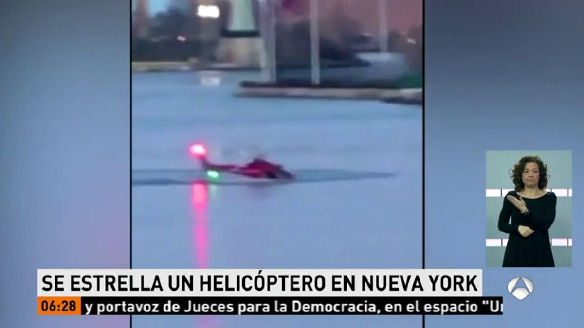 Al menos dos personas han muerto al estrellarse un helicóptero en Nueva York. El aparato, que pertenece a una compañía de vuelos turísticos, cayó al río y volcó con seis personas a bordo. El helicóptero queda casi sumergido en el río. Cuatro personas han resultado heridas, tres han sido trasladadas a un hospital cercano en estado crítico. El piloto ha sido el único que ha conseguido salir por sus propios medios. Aún se investigan las causas del siniestro.