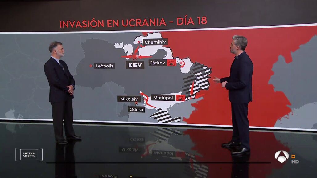 Juan Rodríguez Garat, almirante en la reserva y exdirector del Museo Naval, explica en directo en Antena Abierta que el primer intento de Rusia fue la conquista de Kieven el inicio del conflicto, lo que compara a dirigirse directamente al rey si se tratara de un tablero de ajedrez. Fracasado ese intento por la resistencia ucraniana, el siguiente paso era una apertura ágil y con cierta apariencia y brillantez, entrando por el norte y por el sur para tratar de aislar a las fuerzas ucraniana que están combatiendo en el Donbás, según este análisis.