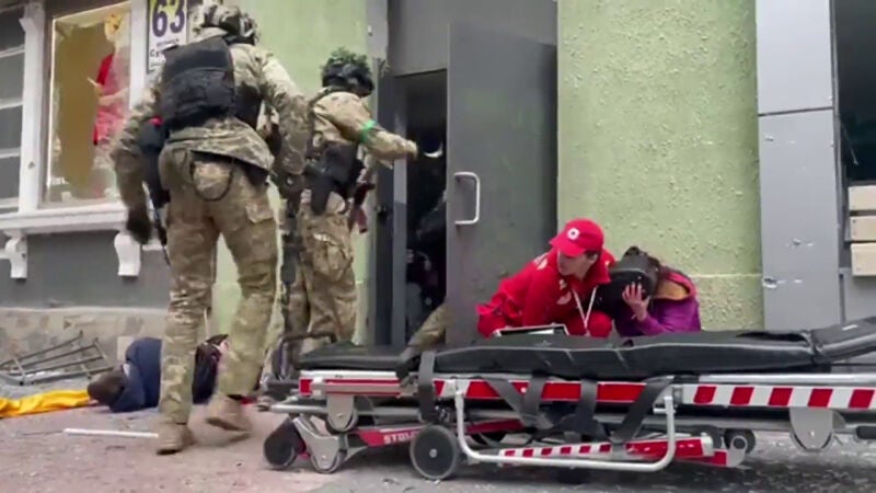 Las imágenes que deja el bombardeo de civiles son realmente duras. En ellas se puede ver cómo los equipos de emergencias ayudan a civiles heridos cuándo de repente las fuerzas rusas bombardean el lugar y todos huyen en busca de refugio. Muchos salen corriendo en un momento de verdadera angustia. En la calle se quedan una mujer, un hombre heridos y el médico que les atendía. El vídeo muestra a los militares buscando refugio. El ataque dura unos segundos y cuando termina todos vuelven a salir para trasladar a las víctimas en ambulancia.