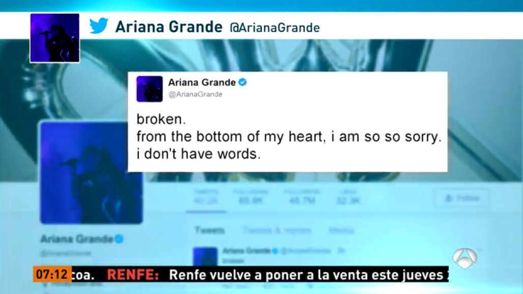 La cantante estadounidense Ariana Grande confesó que no tenía palabras para expresar sus sentimientos, tras la explosión al término de su concierto en Manchester que ha causado 22 muertos y 59 heridos. "Rota. Desde el fondo de mi corazón, lo siento mucho. No tengo palabras", afirmó la estrella del pop en un mensaje de Twitter que recibió más de 83.000 adhesiones en apenas diez minutos.