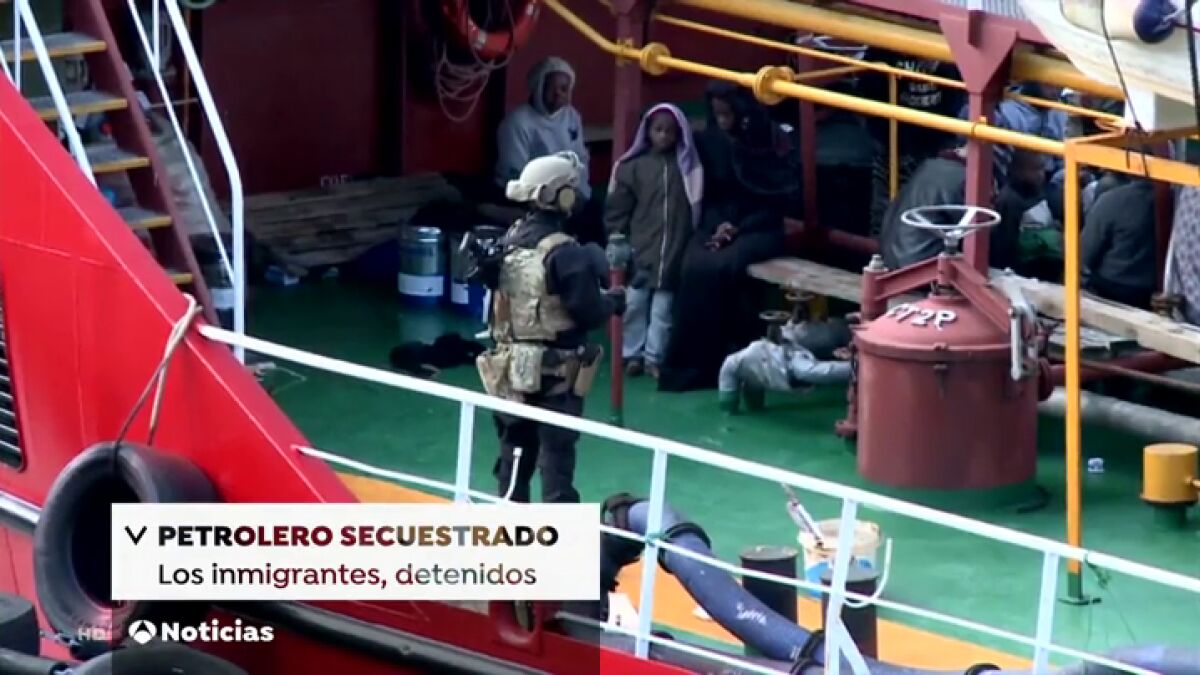 El petrolero secuestrado por un grupo de inmigrantes rescatados en el Mediterráneo ha llegado a Malta tras ser abordado fuerzas especiales de ese país. Han sido desembarcados, esposados y escoltados por la policía.