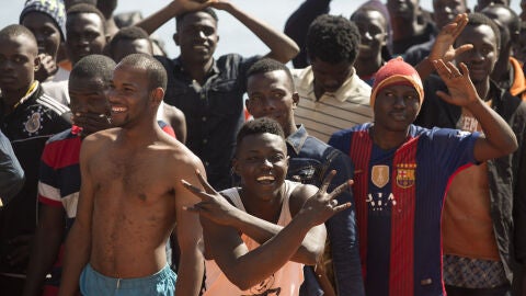 Así celebraron los 600 inmigrantes subsaharianos la llegada del barco de salvamento de la Guardia Costera italiana