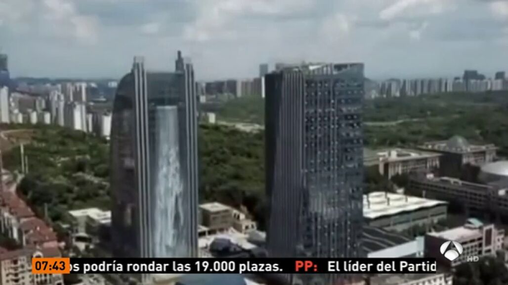Una enorme cascada artificial de 108 metros de altura cae por una de las fachadas del edificio Liebian, un rascacielos situado en el distrito comercial de la ciudad de Guiyang, en el sudoeste de China. Con ello se espera incrementar el flujo de turistas, así como refrescar los calurosos días de verano