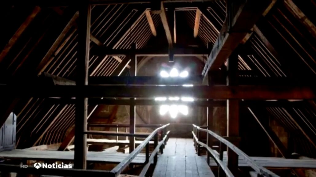 Dentro un robot refrescaba la zona mientras que del techo aún caen cenizas incandescentes. Sofocar el incendio era complicado también por este armazón de madera milenaria que sujeta la cubierta.