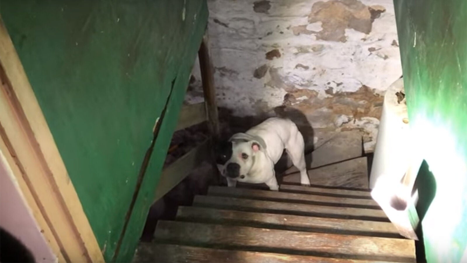 Stray Rescue recibió una llamada en la que se alertaba de que habían comprado una casa y había un pitbull encadenado en el sótano. Cuando los miembros de la protectora fueron al domicilio encontraron al perro encadenado en un oscuro sótano con una cadena muy corta.
