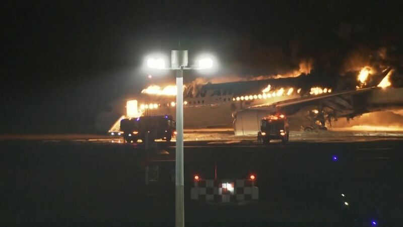 Un avión con casi 400 pasajeros aterriza en llamas tras chocar con otra aeronave dejando 5 muertos en Japón