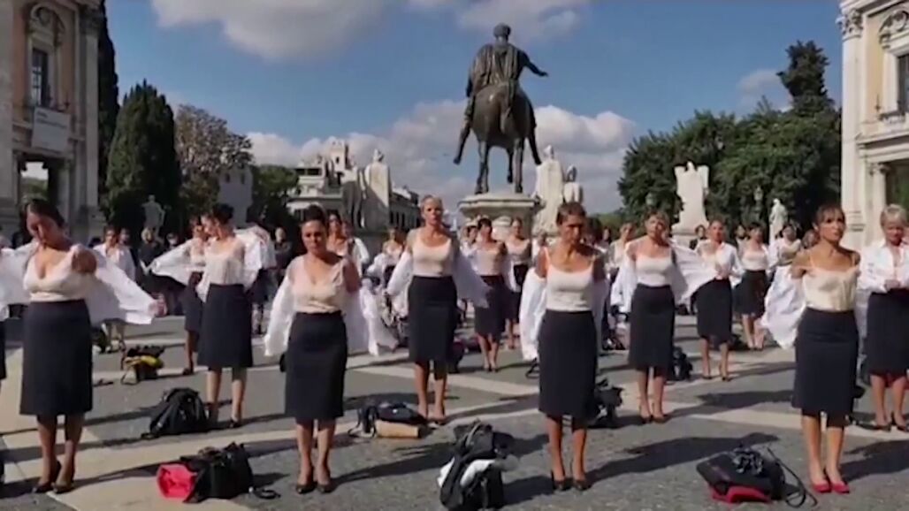 Cerca de medio centenar de asistentes de vuelo se han colocado por filas en lo alto de la colina Capitolina. A continuación, de forma sincronizada, han comenzado a quitarse la ropa, empezando por sus chaquetas, faldas y finalmente sus zapatos. Tras esto, han permanecido en silencio, descalzas y vestidas únicamente con una combinación, durante varios minutos.