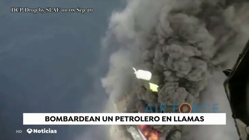 La última imagen que llega desde la India es curiosa y espectacular. Y es que se ha bombardeado un petrolero con 300.000 toneladas de petróleo que se estaba quemando en la costa de Sri Lanka para tratar de extinguir el incendio. La explicación es que este producto es capaz de reducir las llamas.