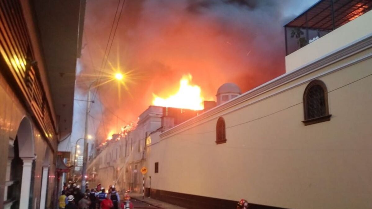 En menos de una hora el fuego ha provocado el derrumbamiento de varias cornisas y las paredes del segundo piso del inmueble, según recoge el medio local 'El Comercio'.