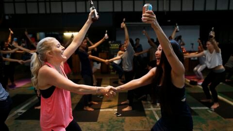 Los participantes de la clase deBrew Yoga enBangkok tratan de equilibrar su postura mientras agarran la botella con una o ambas manos. "La cerveza ayuda a reducir las barreras entre personas", explica la organizadora del evento.