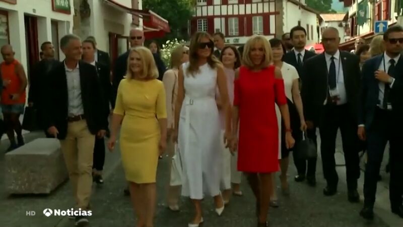 Las seis esposas de jefes de estado o de gobierno, incluida Melania Trump, asistieron a una demostración de pelota vasca y un concierto de canciones vascas antes de reunirse con los comerciantes en las calles de Espelette, a unos treinta kilómetros de Biarritz.