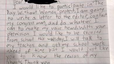 Una niña de 10 años de Carolina del Norte ha escrito una carta a su director del colegio en la que le explicaba por qué no asistía a clase para formar parte de la protesta nacional 'Un día sin mujer', con motivo delDía Internacional de la Mujer, celebrado ayer 8 de marzo.