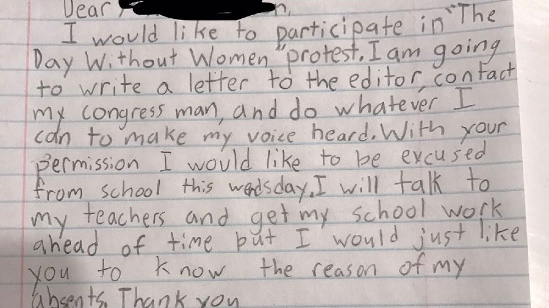 "Me gustaría participar en la protesta del 'Día sin mujeres'. Voy a escribir una carta al director y hacer lo que pueda para hacer oír mi voz. Con su permiso, me gustaría no ir al colegio el miércoles. Hablaré con mis profesores y voy a tener listos mis deberes antes, pero me gustaría que supiera la razón de mi ausencia".