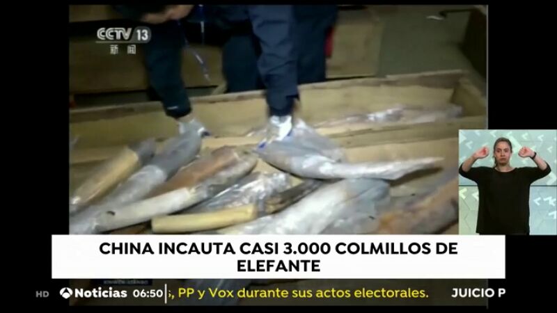 Las autoridades chinas han interceptado casi tres mil colmillos de elefante, más de 7 toneladas, en una redada contra el tráfico de animales. La policía ha detenido a 20 personas.