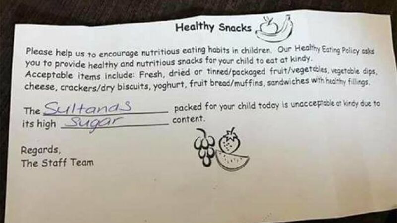 La nota fue entregada a la madre después de que la hija llevara al colegio pasas sultanas para almorzar. "Las pasas que le has puesto a tu hija hoy son inaceptables debido a su alto contenido en azúcar. Un saludo, el personal de la guardería", decía la nota.