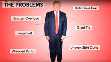 A través de un vídeo, GQ la publicación recomienda a Trump cambiar el estilo de sus pantalones por uno más estrecho, la corbata también por una más estrecha, hacer parecer que se vean sus manos más grandes, un tono de bronceado más claro y de pelo más oscuro... tras todo esto el resultado sería el siguiente.