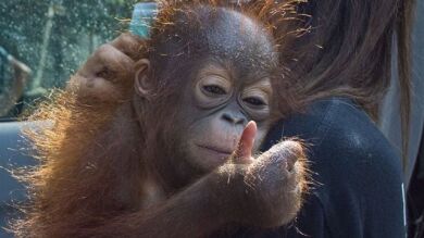 La conmovedora historia de una bebé orangután que sube el pulgar tras ser rescatada de su cautiverio en Indonesia