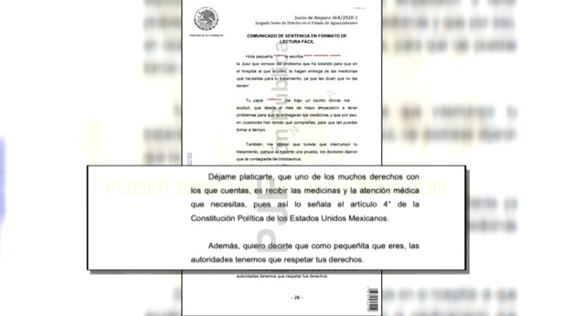 El fallo judicial fue dictado a favor de la niña enferma de cáncer, sin embargo para sorpresa de todos la magistrada responsable del caso decidió escribir otra sentencia en la que, de forma más sencilla y menos técnica, le explicaba a la menor que "al darme cuenta que tu papá tiene razón al decir que las autoridades del Instituto Mexicano del Seguro Social, han puesto enriesgo tu salud, dicté una sentencia en la que se les ordena que vigilen que en la farmacia del hospital al que acudes, se tengan las medicinas que necesitas y que te den todas facilidades para que puedas seguir con tu tratamiento".