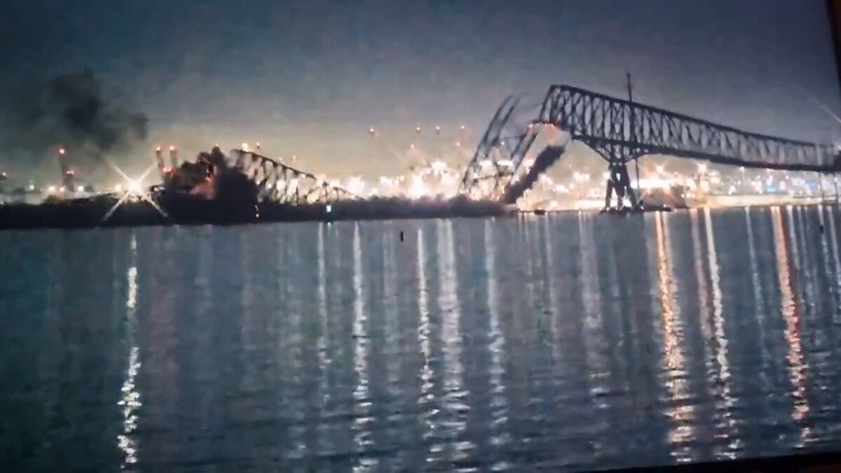 Tragedia en Baltimore, Maryland (costa este de Estados Unidos). El puente Francis Scott Key se ha derrumbado. La causa de que se haya venido abajo la infraestructura de casi tres kilómetros es el choque de un barco carguero que impactó contra uno de sus pilares, según informaron medios locales que citan a fuentes municipales y policiales.