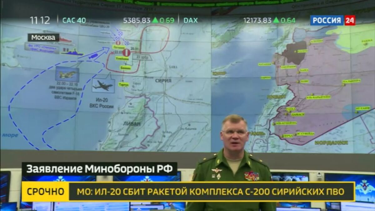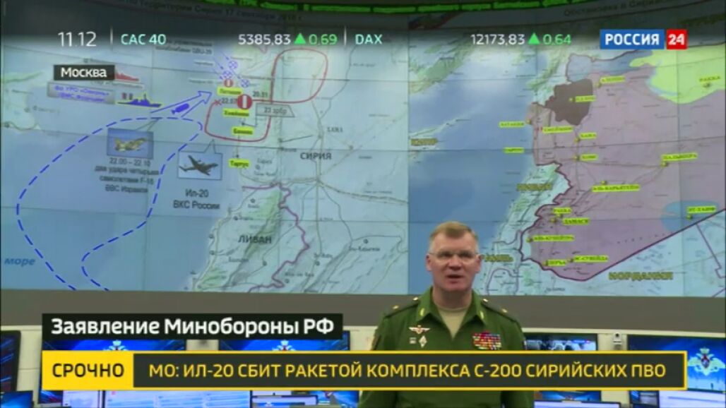 El portavoz de Defensa indicó que Israel no comunicó con la debida antelación al mando de la agrupación rusa destacada en Siria de su planes de ataque y que avisó de este segundos antes de que se produjera, lo que no permitió sacar el IL-20 a una zona segura. "Calificamos estas acciones provocadoras de Israel como hostiles. Como resultado de estas acciones irresponsables de los militares israelíes murieron 15 militares rusos (...). Nos reservamos el derecho a adoptar acciones de respuesta adecuadas", recalcó el general.