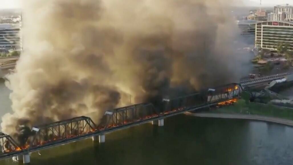 Un tren de carga ha descarrilado en un puente sobre el lago Tempe Town, en Arizona, Estados Unidos. El accidente ha provocado un gran incendio, además de que colapsó el puente. Se desconocen las causas del accidente.