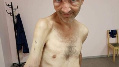 En una imagen difundida por el Ministerio de Defensa de Ucrania se puede ver Dianov muy delgado, con los huesos de los brazos deformados y la cara hinchada por los golpes.