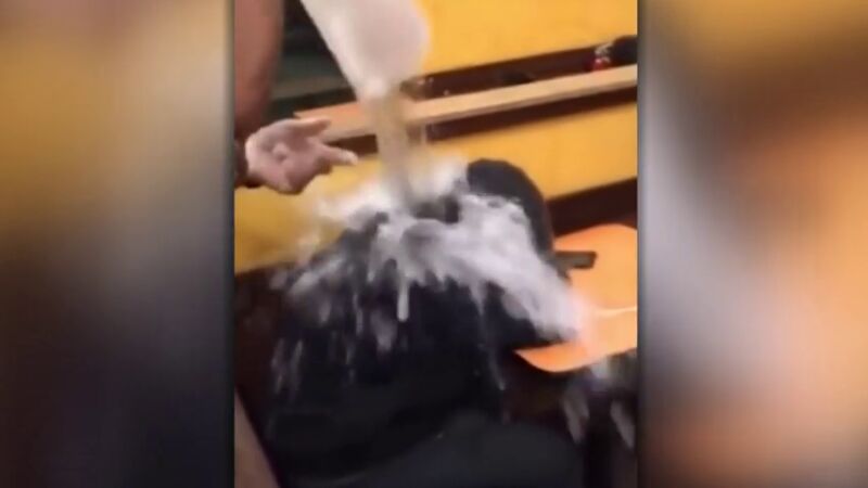 A uno de los empleados del establecimiento no le gustó la actitud y le echó encima una jarra de agua fría para despertarlo, mientras lo grababan para subirlo a las redes sociales.