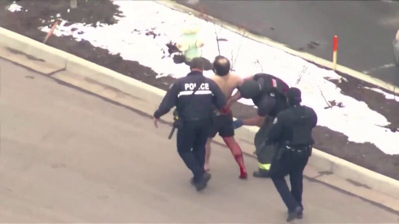 No han trascendido detalles personales del presunto autor del tiroteo en un supermercado de Colorado (Estados Unidos), pero imágenes difundidas mostraron a dos agentes escoltando a un detenido en ropa interior y con la pierna ensangrentada que pese a la herida podía caminar por sus propios medios.