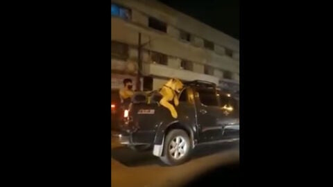 Hoy circulan en las redes sociales vídeos del felino subido a la parte trasera de una camioneta negra acompañado de tres jóvenes y con las patas delanteras colgando por fuera del vehículo, en medio del tráfico.