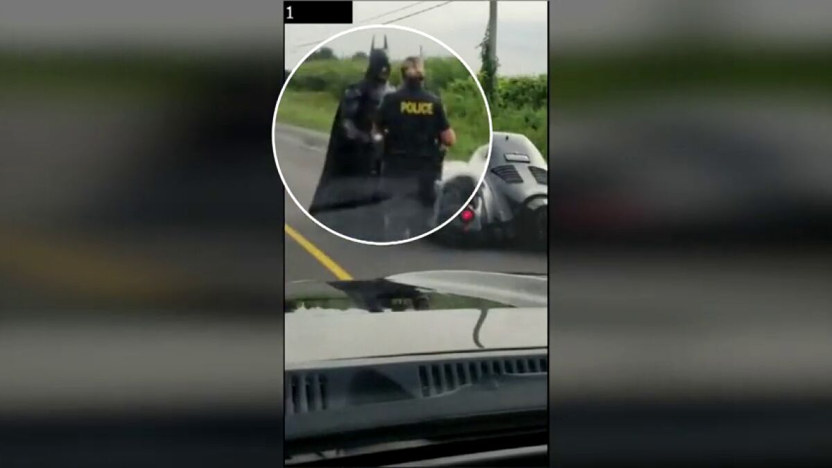 En unas imágenes difundidas a través de Facebook y que se han vuelto virales, se puede ver el momento surrealista en el que la Policía de Canadá detiene a 'Batman' en su 'Batmóvil' en una carretera muy transitada de Ontario.