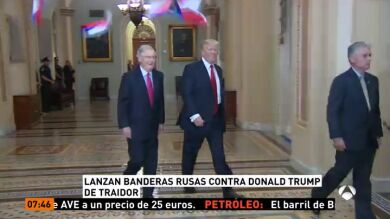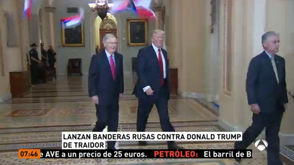 Un hombre fue detenido por arrojar banderas rusas al presidente de Estados Unidos, Donald Trump, mientras se dirigía a un almuerzo con senadores republicanos en el Congreso en Washington para abordar sus planes de reforma fiscal. El manifestante, identificado como Ryan Clayton, de 36 años, lanzó las banderas, en las que figuraba escrita la palabra "Trump", al gritó de "¡Trump es traición!". "¿Por qué está usted hablando sobre recortes fiscales cuando debería estar hablando de traición?", preguntó Clayton, mientras el presidente caminaba junto el líder de la mayoría republicana en el Senado, Mitch McConnell.
