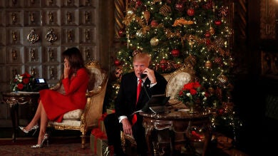 Todos los años, en Nochebuena, el NORAD pretende rastrear el vuelo de Papá Noel y su trineo tirado por sus renos, una tradición que se lleva a cabo desde 1955 cuando una tienda departamental extravió un número de teléfono equivocado, enviando una avalancha de llamadas a un coronel del NORAD que jugaba con ellos. Sentado en una silla dorada al lado de la primer dama, Melania Trump, el presidente ha hablado por teléfono con los jóvenes y sus padres con entusiasmo.