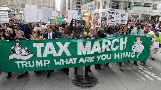 Los convocantes de esta Manifestación de los Impuestos o 'Tax March' se han concentrado en Nueva York, pero hay más de 150 convocatorias en todo el país y en el extranjero para denunciar la negativa de Trump a presentar sus cuentas, una tradición cumplida durante los últimos 40 años por los anteriores inquilinos de la Casa Blanca.