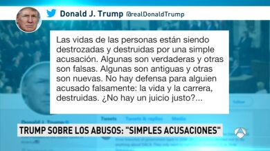 "La vida de la gente está siendo destrozada y destruida por simples acusaciones. Algunas son verdaderas y otras son falsas. Algunas son viejas y otras nuevas. No hay recuperación posible para alguien que ha sido acusado falsamente: su vida y su carrera se van. ¿Es que ya no existe debido proceso?", dijo Trump en Twitter.