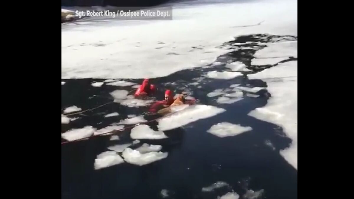Dos bomberos se lanzan a un lago helado para salvar a un perro que quedó atrapado en el agua