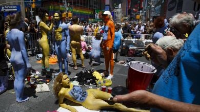 "Se puede apreciar el voyeurismo estadounidense", bromeó. A tan solo unos metros de la muestra, que avisaba en un cartel sobre sus escenas de nudismo, un coche de policía y agentes armados vigilaban el concurrido enclave, escenario de un múltiple atropello hace menos de un mes. "Qué contraste", comentó al pasar junto a ellos uno de los modelos nudistas, con el mensaje "el color no importa" pintado sobre el pecho.