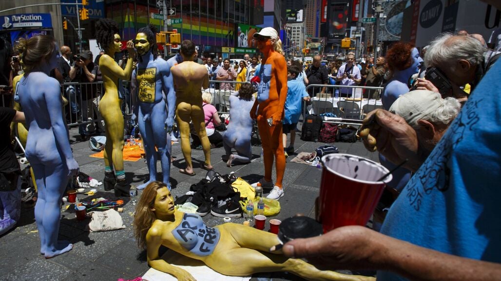 Unas 200 personas se desnudan y lucen mensajes de aceptación en su cuerpo en Times Square