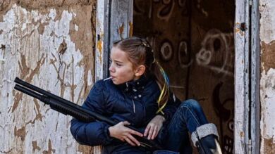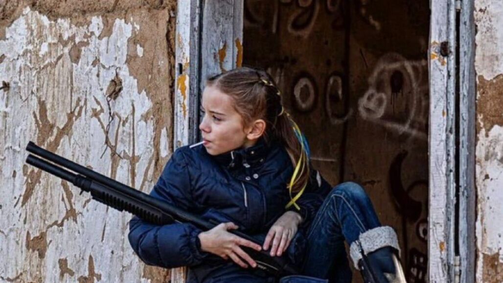 La dura imagen de una niña con una piruleta y un fusil de asalto que refleja la realidad de los más jóvenes en Ucrania