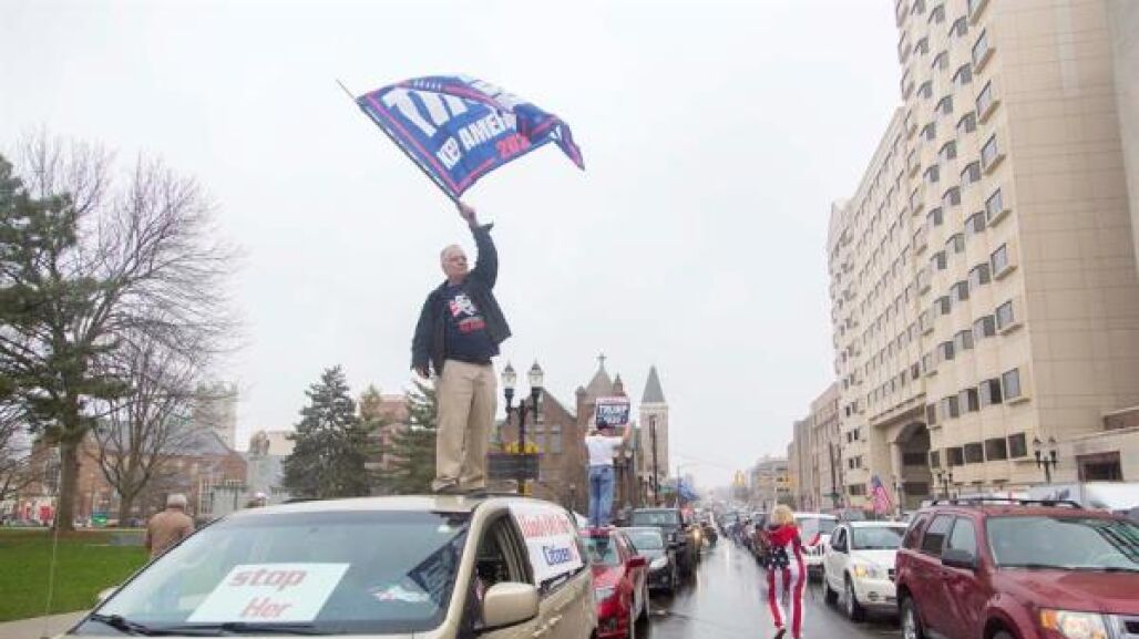 Una extensa caravana de vehículos haciendo sonar sus bocinas y adornados con banderas del país y de la campaña electoral de Trump recorrió los alrededores del Capitolio de Lansing, la capital del estado, como parte de la que denominaron 'Operación atasco', organizada por la Coalición Conservadora de Michigan y convocada a través de redes sociales.