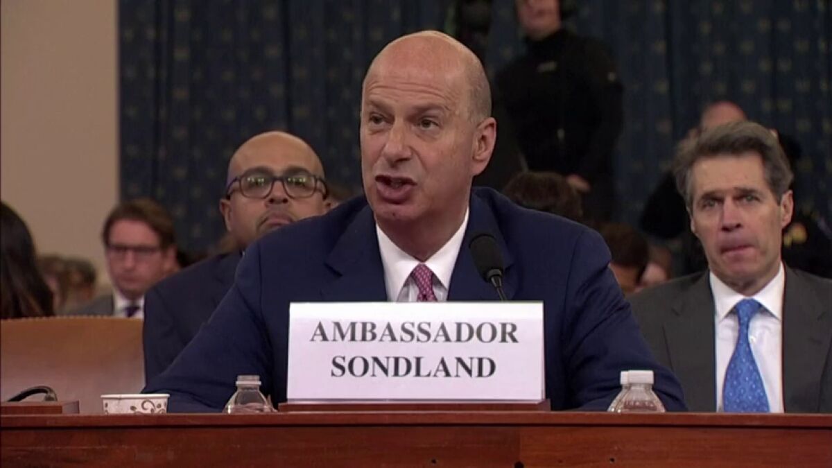Gordon Sondland aseguró en su declaración que hubo "quid pro quo" en Ucrania, al condicionar la ayuda militar al país a una investigación sobre la familia del ex vicepresidente y posible rival electoral Joe Biden.