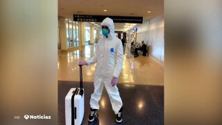 Además del mono blanco, también lleva puestos guantes de látex color lila, mascarilla verde y gafas transparentes.