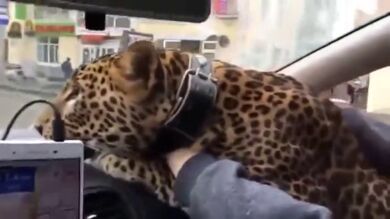 El taxista sabía que un animal se iba a subir en su coche. Su dueño, cuando pidió el taxi, dijo: " Viajo con un gato grande en mi regazo". Pero no se esperaba que en realidad no fuera un gato sino un leopardo. Tuvo que viajar en la parte delantera del coche y en todo momento se mostró juguetón.