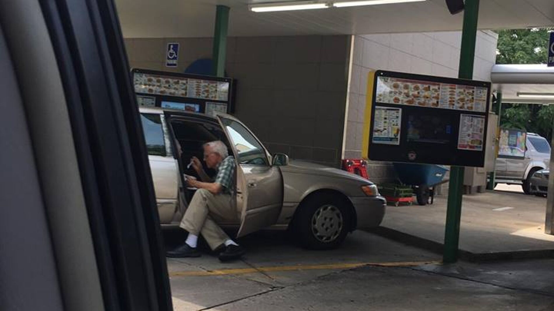 Se trata de una imagen en la que se puede ver a un anciano sentado al lado del copiloto de su coche dando de comer a una mujer. Según cuenta Brent Kelly, quien ha compartido la fotografía, paró en una tienda para comprar un helado para él y sus hijos porque hacía mucho calor.