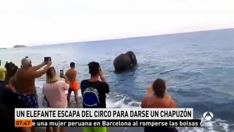 Decenas de bañistas observan de cerca a un elefante que se ha escapado de un circo en Italia, pero nadie se atreve a darse un chapuzón con él. Su aventura terminó cuando los responsables del espectáculo fueron a buscarle.