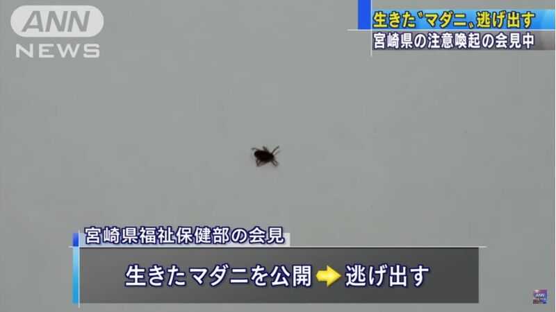 En una conferencia organizada por el gobierno de la prefectura de Miyazaki, Japón, para concienciar sobre el síndrome de la trombocitopenia transmitida por garrapatas (SFTS, en sus siglas en inglés), después de que varios residentes de la zona enfermaran. Se llevó una garrapata viva y otra muerta para que los periodistas pudiesen fotografiarlas, pero cuando uno de los funcionarios intentó recoger al insecto vivo, éste desapareció.