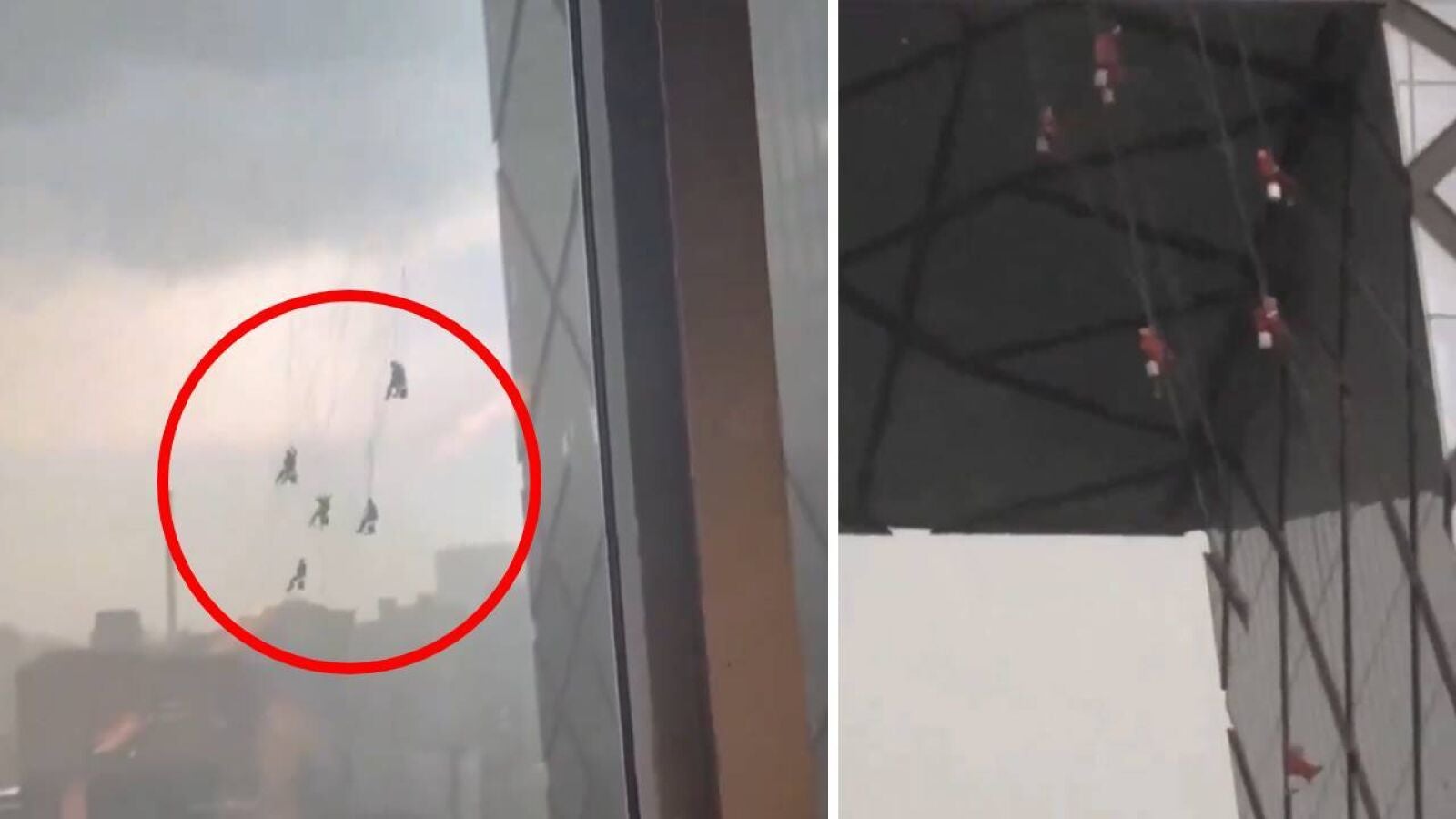 A pesar de ello, siete de los obreros salvaron la vida gracias a las cuerdas de seguridad. Los habitantes grabaron la situación desde el suelo presos del pánico que provocó la situación. En las impactantes imágenes es posible ver cómo cuelgan los trabajadores del cielo. Los vídeos del momento no tardaron en viralizarse en las redes sociales.